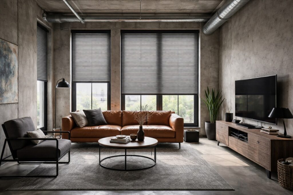 Metal blinds in brushed aluminum or matte black reinforce the aesthetic. Dark roller shades can also complement the urban palette.